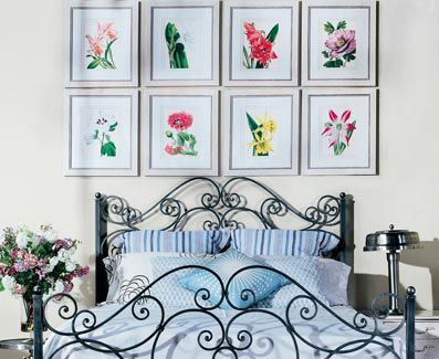 装饰画是家中寻常所见,最重要的是多幅装饰画的组合方式,各样的组合和画面的格调统一是墙面出彩的关键所在。挑选八个花色的工笔画法的花草装饰画,用画框裱一下,四个一组,上下两层,装点在铁艺床床头后边的墙面上,墙面立刻拥有了一片葱郁的花园景象。