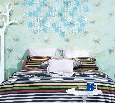 在墙面前可以增加一道帘,它的出现让墙面有了立体感和层次感。这个已经贴有花案壁纸的墙面,若还想拥有另外一种装饰效果,可在上面覆盖一层半透明效果的挂饰。只要将挂饰一个个拼插起来,形成一道美丽的装饰帘,把帘子直接搭扣在贴有壁纸的墙面上,墙面就拥有了双层装饰效果,美不胜收。