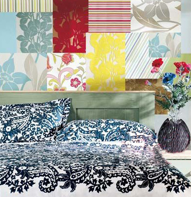 搭配:涂刷有绿色油漆的木床,与浅绿色的墙漆修饰成利用装修剩下的碎壁纸的墙壁有些靠色,床上选用深蓝色花案的床品,营造一派海水蓝的清亮效果,床头后边的墙壁上,用或条纹、或花案的蓝色和绿色壁纸进行搭配,更富有层次感。