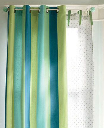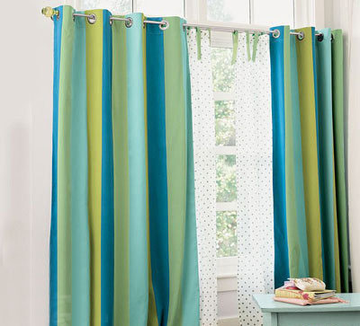 搭配点评:蓝色系的“深蓝、浅蓝、灰蓝、草绿”等几款深浅不同的色彩组合成这款窗帘,给人特别清爽怡然的感觉。仿佛站在那纯美的地中海海岸,即使无风也清凉。窗帘里面还配上了黑色小圆点图案的纱帘,为直线条的过于干练色彩,增添了一丝柔美。