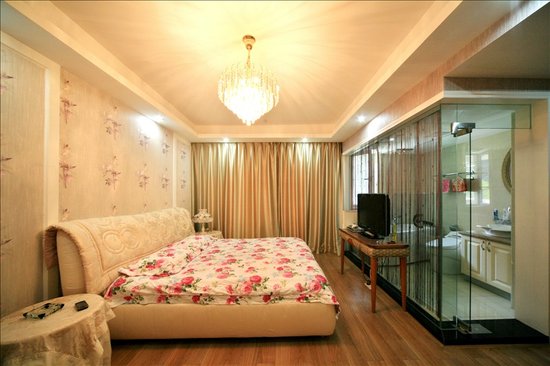 用透明玻璃取代了原来的卫生间隔墙,打破了传统的封闭式设计,仅用屏帘遮挡视线,带来一种朦胧、暧昧的情调。同时还从视觉上增加了卧室面积,更显品质。小碎花图案的床品,搭配紫罗兰图案的背景墙,营造出温馨甜蜜的田园美感。
