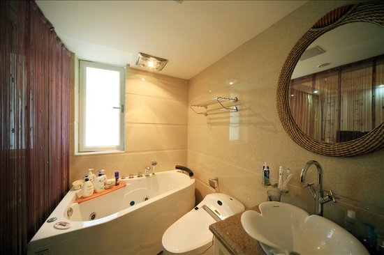 枣红色屏帘内的浴室别有一番风情,花朵型的洗手盆,配上金属编织镶边的镜子,呈现出一种轻松活泼的曼妙感觉。从卧室望去,精心搭配的卫浴让人赏心悦目。