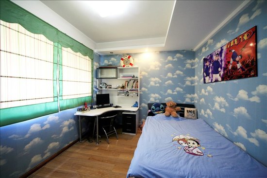 蓝色调为主的儿童房一派碧海蓝天风范,白云图案的壁纸、嫩绿色窗帘与书柜上摆放的游泳圈相映成趣,为居室吹来绵延不绝的纯净海风,营造出清新自然的氛围,为儿童带来自由自在的成长环境。