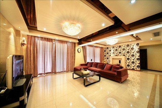 纯白瓷砖地面在暖色调灯光的照射下,折射出熠熠夺目的耀眼光泽。吹风飘动的藕色窗帘,为居室吹来一丝性感情调。花朵图案的黑白色背景墙从优雅氛围中跳跃出来,为客厅增添了活泼自由的感觉。