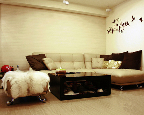 色彩的运用使客厅和过道浑然天成。简单的布置,沙发,茶几,电视满足了最基本的闲暇娱乐时光。电视柜上的布帘,随意摆放的靠垫,都选择了大花型图案,顿时打破了空间的单一感。