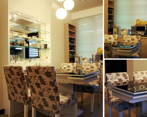 黑白两色的大面积使用难免会给人觉得平淡。但当白色的实木餐椅坐垫描绘上黑色的雕花纹,有黑有白的相互衬托方显其个性分明的家居风格。