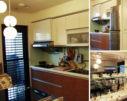 各类用具整齐地排放在操作台上,下上两层柜子解决了物品的储藏问题。白色的橱柜保持风格的统一,缤纷的餐具用品解除了视觉疲劳,动物造型的挂钩紧跟自然的脚步。
