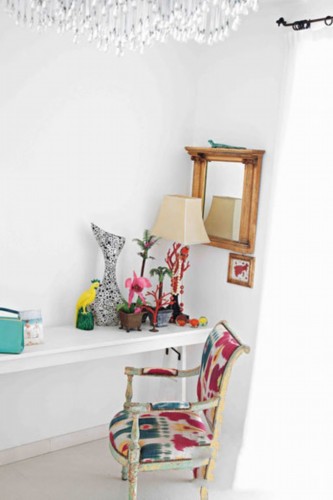 在家中墙面凹入的一角,因地制宜地安一块搁架,摆放各色玲珑小物与色彩出挑的扶手椅,别致的梳妆台就此建成。