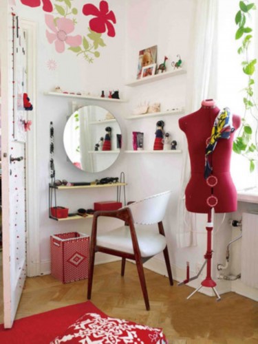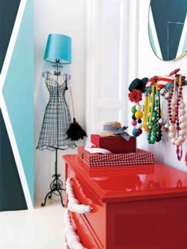 这个色彩斑斓明丽的门边角落,是女主人每日对镜梳妆打扮的所在。红色钢琴漆的台面光泽十足,各色装饰项链有趣地悬挂在水管上,模特式落地灯也可一物两用
