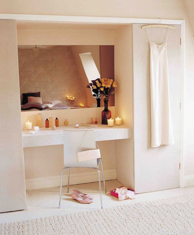 浅米色的墙面、桌面和椅子,浅茶色的镜子、丝缎般的睡裙,女主人的品位由此可见一斑。梳妆台上随时点起香氛蜡烛,浪漫意境令人沉醉。