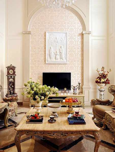 色彩,米黄色的优雅浪漫情怀:白色、金色、黄色、暗红是新古典风格中常见的主色调,少量白色糅合,使色彩看起来明亮、大方,使整个空间给人以开放、宽容的非凡气度,让人丝毫不显局促。目前运用比较广泛的应该是“米黄色的优雅浪漫情怀”。