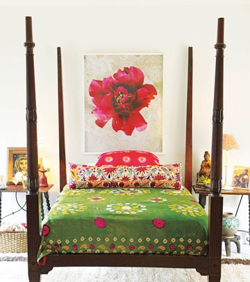 房间采用红绿色间的碰撞让冬季的卧室活泼起来。靠枕配合着床单的调子,而墙面上一朵艳红色的花也取自床品颜色之中,让空间释放出这个季节所没有的热情奔放。