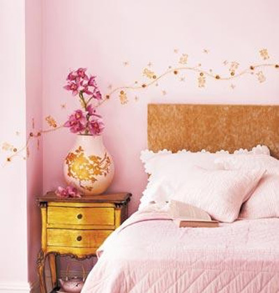 整体效果粉色系非常适合给卧室营造婉约、柔和的感觉。床品具有花边装饰,旁边的花瓶以及里面的鲜花都突出了柔美的感觉,墙面的设计非常适合居室环境。