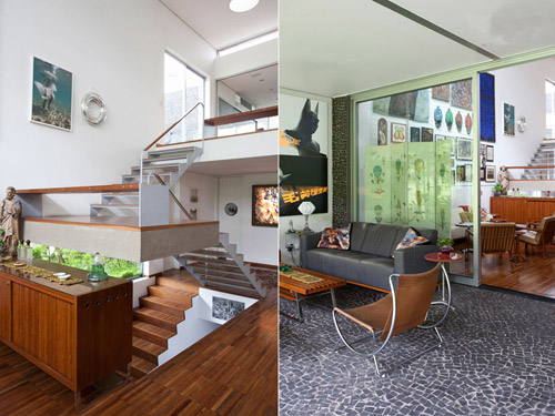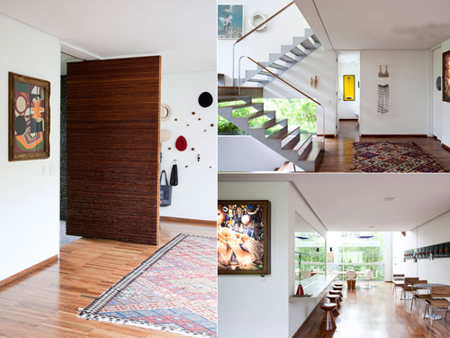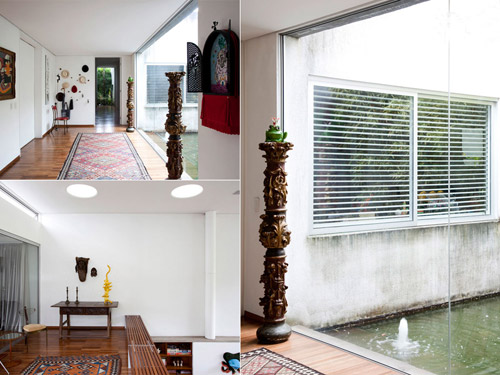屋内的地板均是木制材料,温暖的质感带来居家的感觉。走廊的墙壁上同样挂着艺术画,最吸引人目光的便是雕刻细致的木柱子,不例外的这同样是来自Useche的设计,每一个细节的堆砌形成了建筑师为自己亲手打造的家。