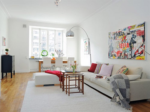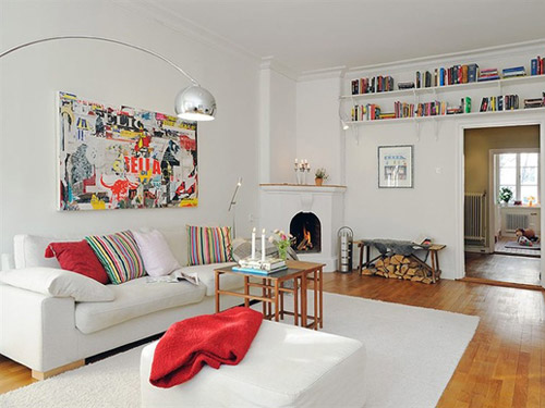 白色为基调的房间,连沙发都是白色的,搭配个红色的抱枕和沙发垫布,显得红色热情如火,鲜艳夺目。墙壁上HIPHOP味浓郁的壁画,以及门框上层的书架,一同增加了房间颜色的层次感。竖纹抱枕的颜色和壁画用的颜色比较近似,让壁画和客厅更恰当地融合在一起。