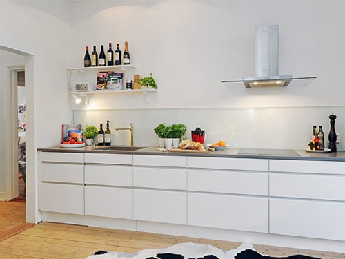 又是一个以纯白色为主基调的空间,用瓶瓶罐罐来给厨房添加颜色层次和立体感。添加适当的绿色植物,调和一下大量白色带来的单调和刺眼的感觉。