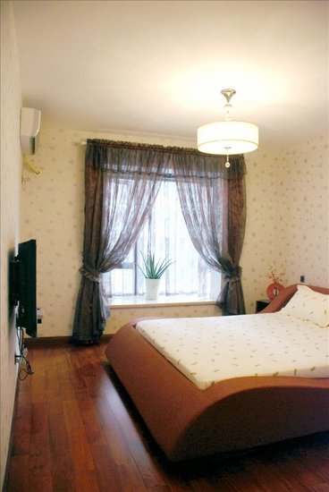 卧室设计比较简洁,注重舒适质感,浅黄色碎花墙纸与暖色调简约吊灯将卧室凸显得温馨静谧,很有设计感的非传统卧床体现出主人的审美品味。当微风徐徐吹来,薄纱窗帘成为摇曳在窗前的暧昧风景。