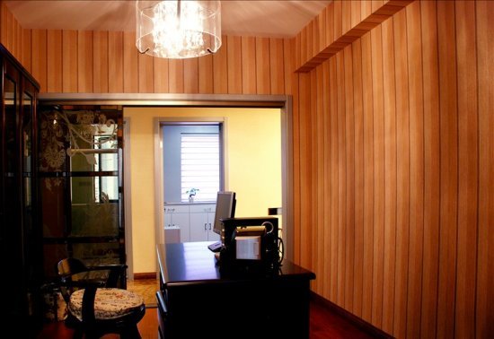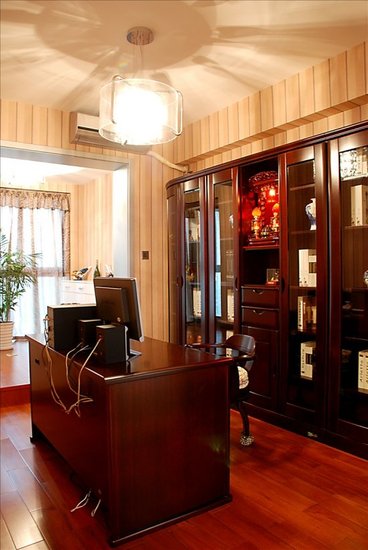 别具一格的木纹环保壁纸触感柔和,将书房的书香之气表现得淋漓尽致。超大宽敞的深咖啡色钢化玻璃滑动门是书房的独特创意设计,张扬个性。
