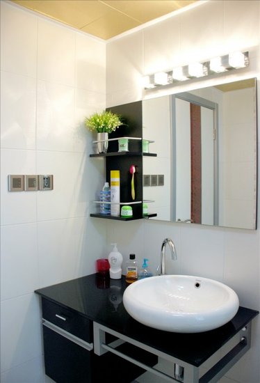 样式简洁的黑色洗手台与象牙白陶瓷洗手盆,犹如棋盘上光滑细腻的黑白棋子,气质优雅。在贴面镜上六个小方块射灯的映衬下,金黄色铝扣板从黑白空间中跳跃出来,显得更加高档贵气,而贴面镜左侧储物架上的翠绿盆栽则给卫生间增添了一抹春色。