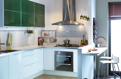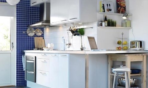 在为厨房“节衣缩食”的过程中,这一步看似不经意,却最有可能有效的为你省下空间。可以折叠的餐桌和椅子,层叠的储物架、电器架等,都是厨房变身的功臣。悬挂在墙上的碗柜和吊顶挂钩等储物工具,有效的节省了不少空间,也让厨房空间整洁干净,操作起来也方便了许多。玻璃门的吊柜让不大的空间显得不再压抑,并且方便了操作。另外,灶台底部的储物柜也容量不小。单品折页式桌面,可根据需要调节桌面的大小;桌面下有方便的储物空间,可以盛放报纸、餐巾等物品。简洁的造型和颜色从视觉上营造出整齐开阔之感。