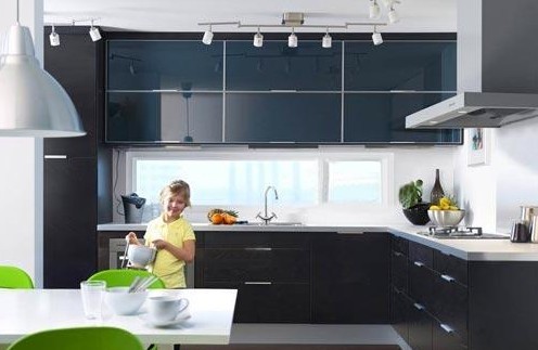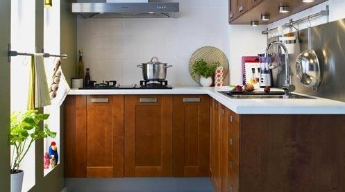 一字型布局简洁、小巧,是空间狭窄厨房的不二之选。T型布局对面积要求也不高,又可融一字型和岛型的优点于一身,大有集大成者之势。此种布局可以清晰的将清洗区和烹调区分隔开来,而且还可以打造出一个简易的餐桌。平铺直叙的一字型布局,绝对让你省心省力。橱柜只占用了一面墙壁,大大延展了空间,简洁的造型让厨房看起来清爽且井井有条。 T字型厨房其实和岛型有些类似,末端可以打造成一个简易餐桌,供家人朋友小酌浅尝,家的随意和温馨就此呈现。窗帘完美的配合了整体氛围,而点缀着红色碎花的餐具不知不觉为这处餐厨空间平添了几分欢快。