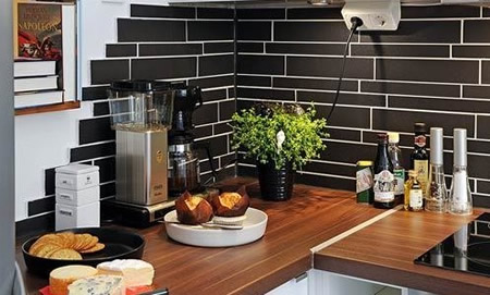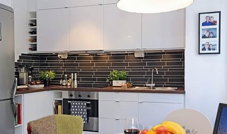 厨房的设计给人的感觉不错,L型的厨房设计是小户型选择的最佳款式,而白色的橱柜,黑色的瓷砖拼贴有着强烈的对比,给人感觉很酷。