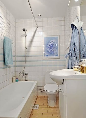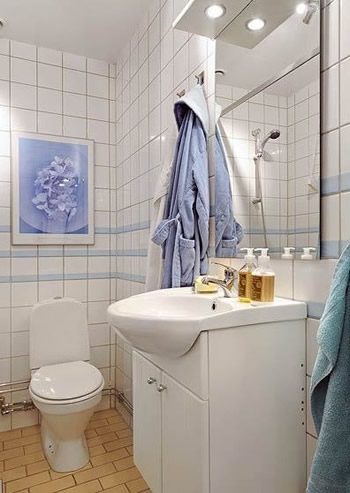 卫生间的设计,小编很心水。蓝色白色拼接的瓷砖和墙上的装饰画放在一起就是绝配。简约设计的洗手台又有强大的收纳,还有良好的照明。