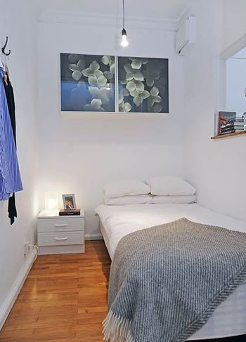 而卧室和客厅的相隔其实就是一扇窗帘,原来卧室的设计也是如此简单。低矮的床头柜可以放置很多的零碎物品,墙上的装饰画真的很漂亮。