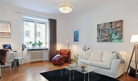 白色的布艺沙发和纯白的墙壁搭配在一起显得很合宜,深蓝色毛毯和白色的沙发有着强烈的对比效果。沙发后的背景墙上挂了一幅装饰画,可以看出屋主向往美国哦!透明而又设计感的茶几很有特色,晶莹剔透。沙发旁的落地灯很多见也很实用。