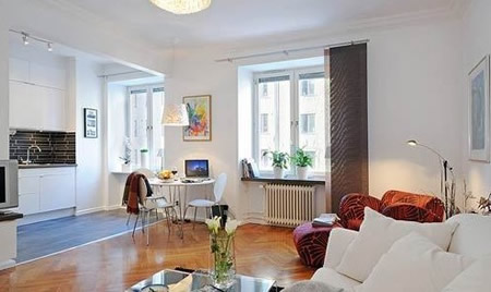 最大的空间就被处理为客厅、餐厅、厨房三合一的居室,敞开式的设计让三个房间互相融合,但是一点都不感到拥挤,大大的空间感觉还是很宽敞的。