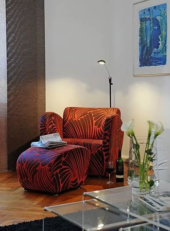 沙发旁的读书角落很不错,来自宜家的单人沙发和脚凳有着新潮而现代的外表,一盏落地灯从后面送上亮光,整体感觉很不错。