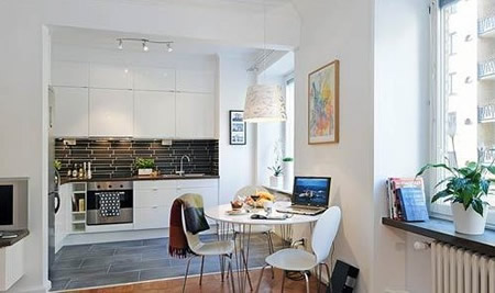 餐桌餐椅放置在客厅和厨房的衔接地带,他们的设计依然很简约很漂亮,白色的外观让人喜爱。墙上的装饰画很好看还有头顶上的吊灯设计实在精美。