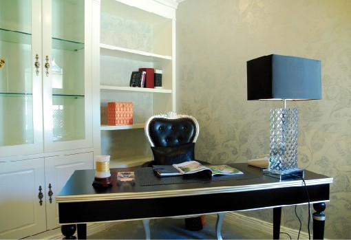 书房延续了黑白灰的主线设计。次卧加入了少许的乡村格调,白色和不同层次蓝色的搭配给人以轻松和活力。