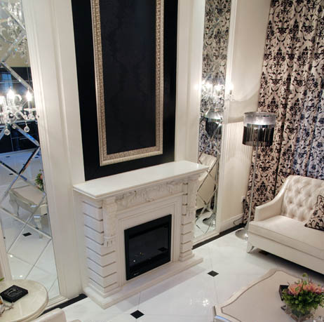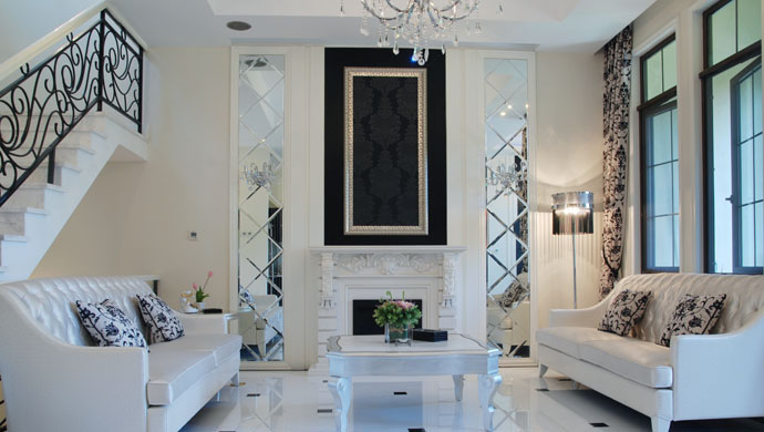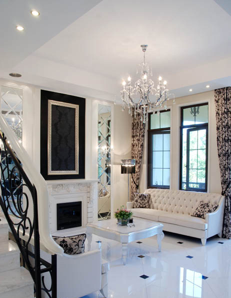踏入客厅,超白的微晶石和黑金砂的碰撞。汉白玉雕花壁炉与黑色鳄鱼皮压纹皮革硬包的对比。银色玻璃马赛克与钢琴漆西橱柜的冲突,让空间当中到处流动着一种冲撞美感。