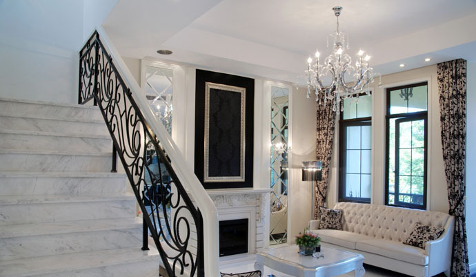 花纹疏浅的爵士白楼梯踏步配以纯黑色锻打手工铁艺栏杆,工艺精巧的爵士白石材包柱,让纵向空间层次分明而连贯。