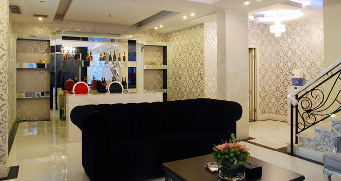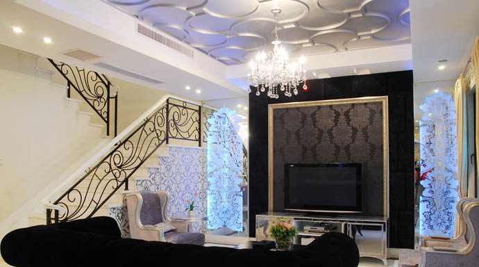 地面超白的微晶石和干净却层次分明的吊顶将白色演绎到底,但白底闪银复古花纹的墙纸和视听区局部顶面手工银箔的设计,将白色的简洁和银色的高贵有机结合。