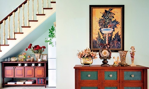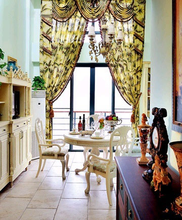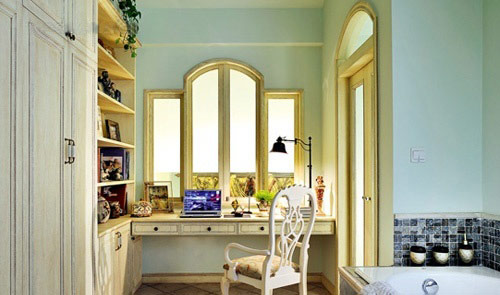 墙身以淡雅的绿色调打底,浓郁的欧式符号构造浪漫情调,装饰重点放在家具颜色、造型以及装饰物上。