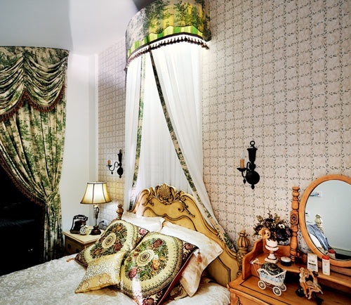 壁灯在床头围合的帷幔中洒下朦胧的光,在这样的环境中入睡,梦应该也是浪漫的。