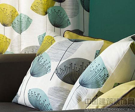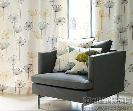 灰色是泥土的颜色,也是现代建筑中常用的颜色,它大气沉稳,但过于硬朗,没有生机,用轻舞飞扬的蒲公英图案布艺弱化这种色彩,把清新和向上的生命力注入到这一片灰色的天地。