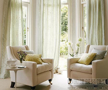 米白色双人沙发,搭配湖水绿般的轻薄亚麻帘,把淡雅的感觉衬了出来。