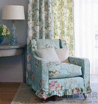 天蓝色田园沙发缀上鲜艳的花朵,搭配黄白花朵为主的窗帘,更显娇艳。