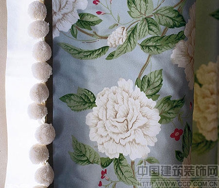 白色花朵为主的窗帘边上还缀着白色的绒球。