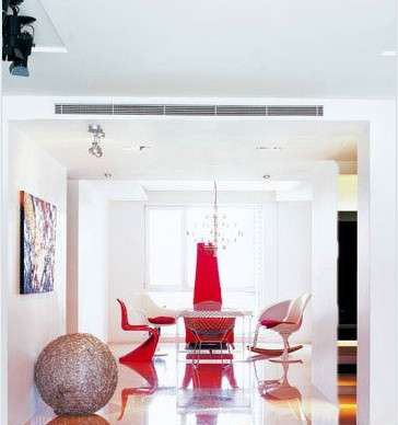 用餐区的气氛,被6把经典餐椅烘托得恰到好处。主题墙的旁边就是开放式餐厅,一共6把餐椅,每把都自成一派,但是颜色都围绕黑、白、红的主色调进行。说到椅子,它们是整间公寓里最生动的表演者,数量不算多,但因为每把椅子都是经典,空间立刻让人心神荡漾起来。