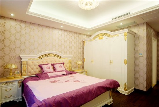 主卧室延续了整体风格,通过精致的细节处理,以及合理的空间布置,给人眼前一亮的感觉。怀旧台灯与复古壁纸为卧室营造出别样风情,而一抹紫色则让空间立即变得唯美浪漫。