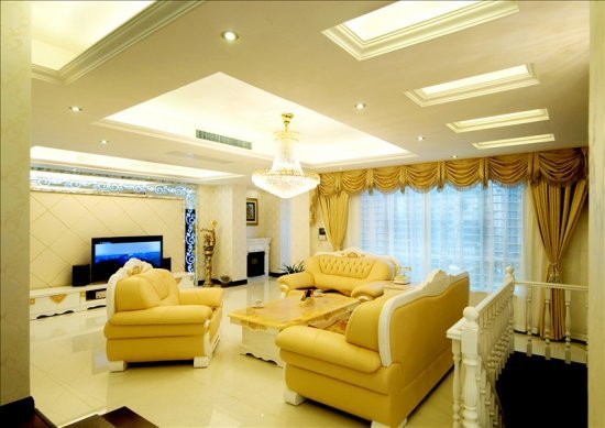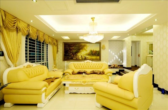 客厅是以米色为基调的典型欧式风格,色彩浓烈、造型精致的欧式沙发,搭配上厚重质感的大理石,营造出稳重气派的视觉效果。镶嵌有蓝色波纹的镜面背景墙精巧雅致,充满了现代时尚感。