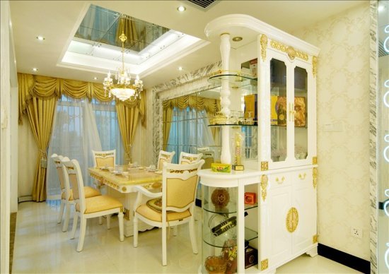 餐厅利用欧式酒柜划分区域,合理布局,更节省空间。带有复古花纹的米色墙纸搭配同色软包餐桌椅,协调而富有层次感。简约时尚的方镜增加了空间通透感,延展了餐厅的宽度,使面积不大的餐厅显得沉稳而不乏柔美。