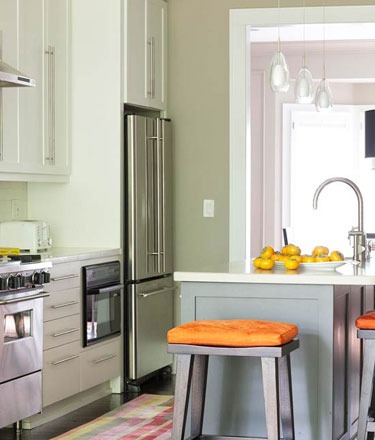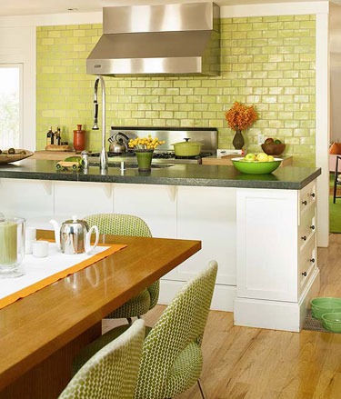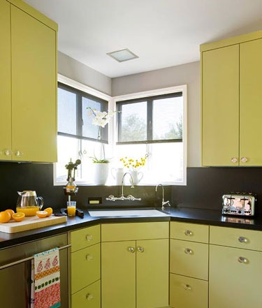 鲜艳的色彩常常需要加入点创意才能发挥到极致,就如同漆成绿色的厨柜需要深色的背景加以衬托才能显出它的活跃。