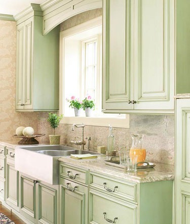 当纯净的浅绿铺满厨柜表面,踏进厨房的那刻一定会给心情减压,维多利亚田园式情调的厨柜造型,其单纯的色调吸引着人们的眼光。