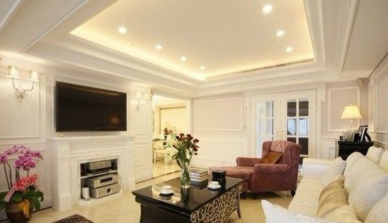 白色具有高级,科技的意象,纯白色会带给别人寒冷,严峻的感觉,在使用白色时,都会掺一些其他的色彩,所以沙发、茶几与电视等都用了深色来打破严肃之感,花朵也增添了活泼的气氛。