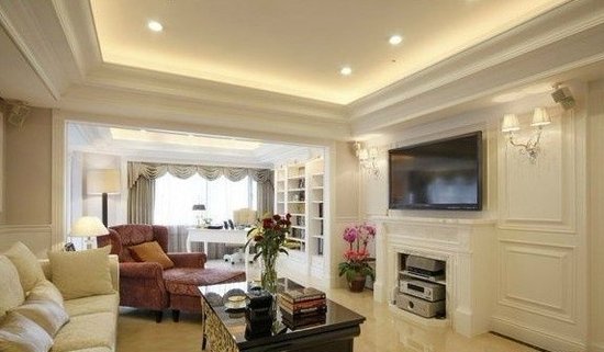 进门处的客厅,既然是120平的房子,我的客厅当然要华丽丽的,米白色的布艺沙发和嵌入式的电视背景墙,客厅的吊顶花了不少银子哦。